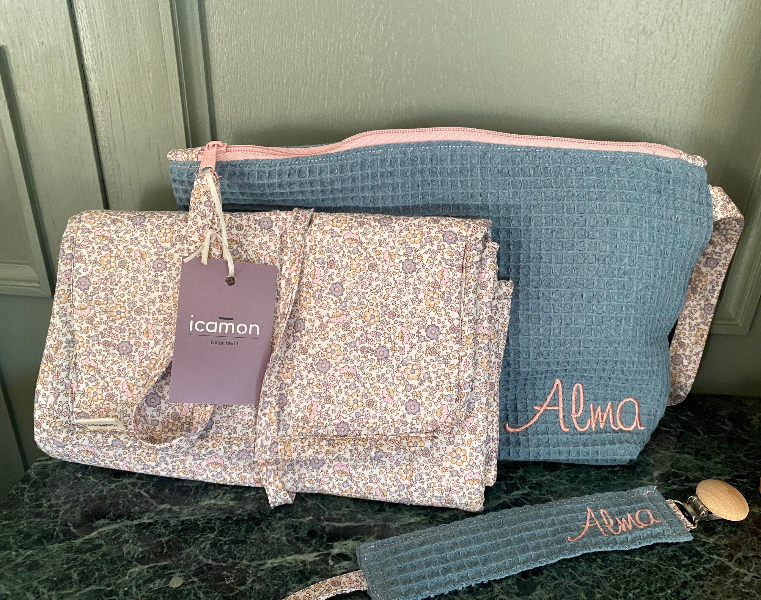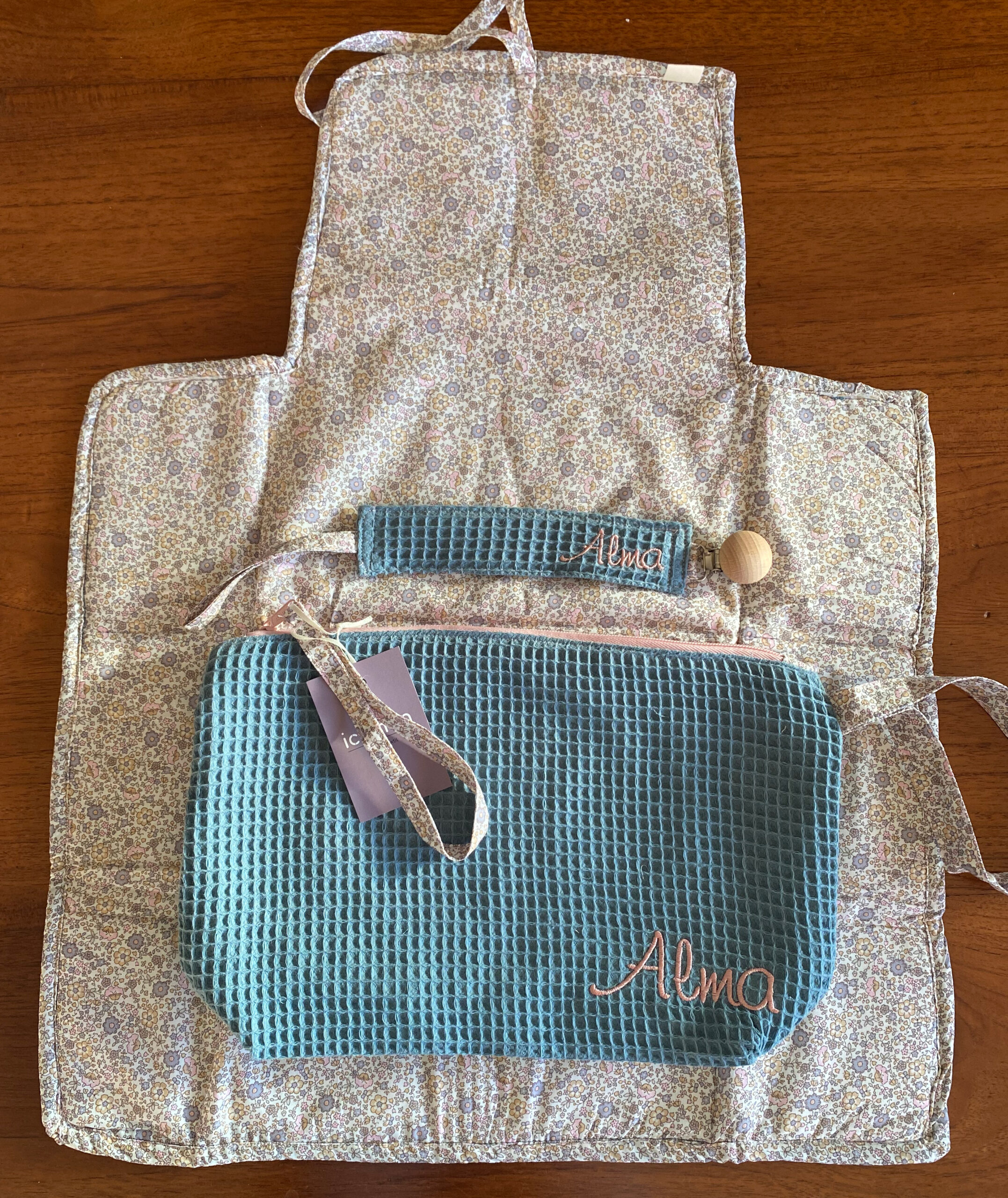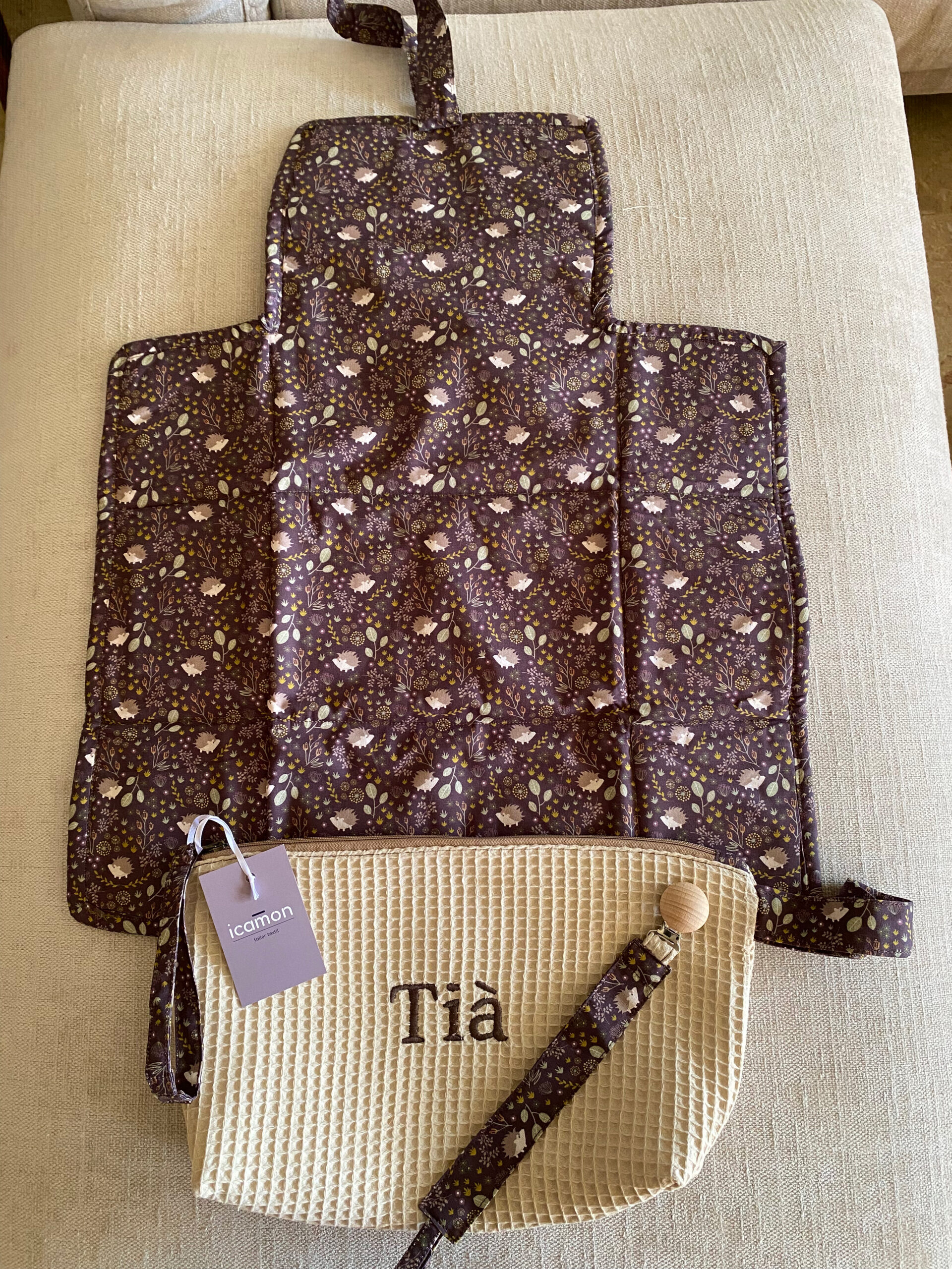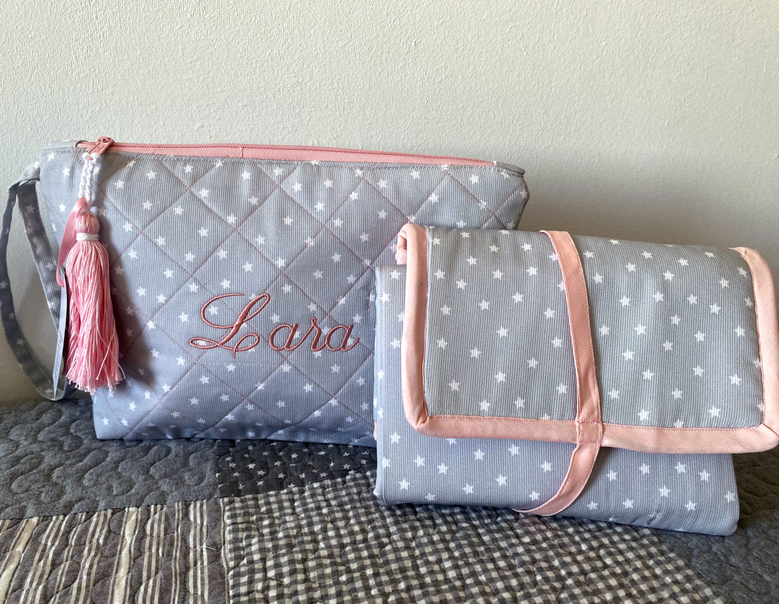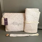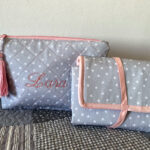- NECESER BORDADO con nombre del bebé, para guardar el cambiador, pañales y toallitas. Tamaño: 33cm ancho x 22 alto x 8cm de fondo.
